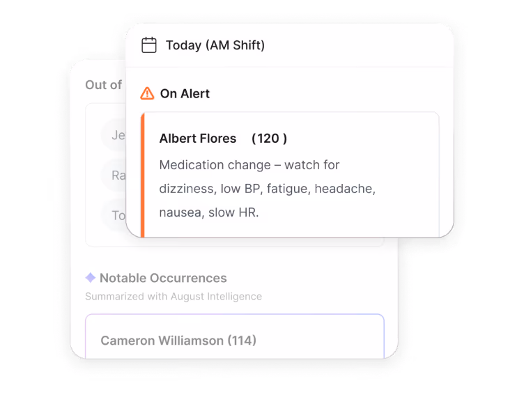Caregivers see what needs attention and when, while automated handoff summaries keep incoming teams fully informed.