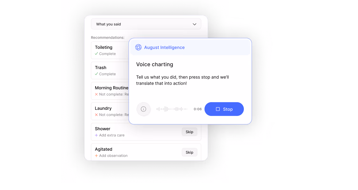 Whether caregivers tap through routines or speak naturally with Voice-to-Chart, Care Track standardizes care capture, so nothing is overlooked.