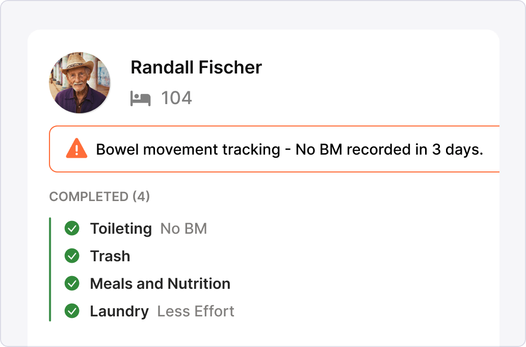 Caregivers can now chart BMs as part of scheduled care or on an as-needed basis. For residents with BM tracking enabled, you’ll see alerts if no BM is recorded in 3 days, to support proactive care. More enhancements are already on the way. Tracking is optional and can be toggled on or off easily.