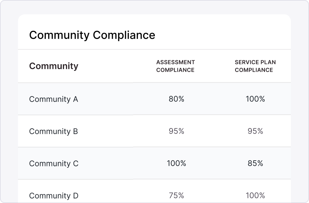 Monitor compliance across all communities in one dashboard, with clear visibility into assessments, service plans, and physician reports. Compare communities against one another and see what regions or communities need your attention. Drill down to resident detail or view community performance at a glance.