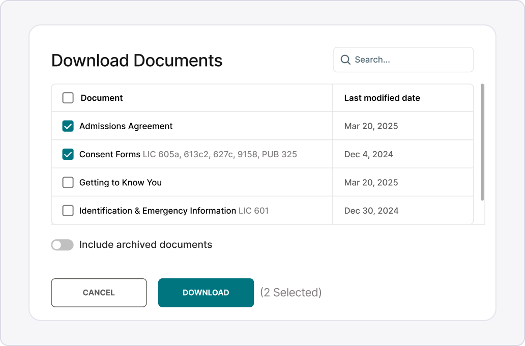 From the Documents tab, you can now download all completed files for a resident with one click. Choose to grab only the most recent versions or include archived copies — perfect for inspections or building a paper administrative file.
