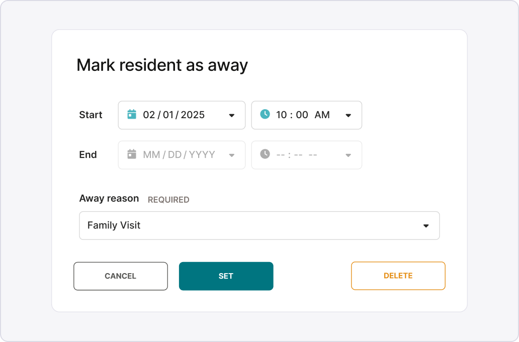 When marking a resident as away, you can now add a reason. These reasons appear in the downloadable Away from Community reports.